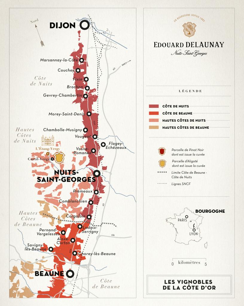 This wine comes from a plot of old Aligoté vines planted by Laurent Delaunay's former oenology professor, Professor Feuillat. It is located in close proximity to the Abbey of Saint-Vivant, whose monks created and cultivated the famous Romanée Saint-Vivant in the Middle Ages. This abbey is currently preserved and maintained thanks to a major sponsorship operation in which the Delaunay family, who are very attached to this site, actively participates. Located on the historic hill of Vergy facing the Château de Charmont, this steeply sloping plot is oriented southeast at an altitude between 420 and 450 meters, on soils of very calcareous white earth.