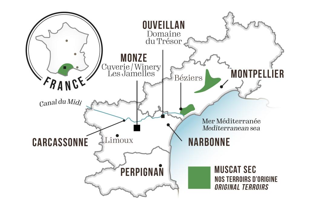 Our Muscat grapes come from two terroirs: the first being the Hérault Valley’s mid-slope vineyards, whose poor, calcareous clay soils, Mediterranean climate and high heat encourage optimal ripening of the grapes, yielding opulent, rich, well rounded wines. The second terroir is the coastal region near Béziers, whose proximity to the sea contributes freshness and minerality to the wine.